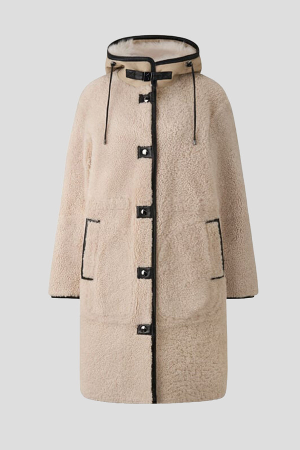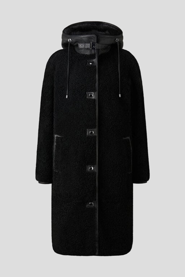 Kaput širokog kroja od krzna ovčije kože sa kapuljačom obloženom Toscana ovčijom kožom iznutra. Blago proširena ramena i rukavi jajastog oblika za stilsku siluetu. Podesiva kapuljača i struk sa kožnim kanapom za podešavanje. Prednji zatvarač uključuje dugmad sa logotipom i metalnu kopču sa logotipom na okovratniku.