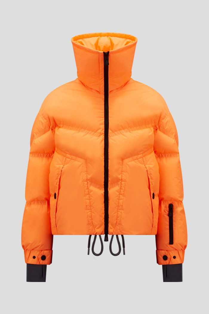 Ostanite toplo i moderno obučeni u ovoj kratkoj Moncler perjanoj jakni za žene. Izrađena od svetlo narandžastog najlona lagane konstrukcije, jakna ima postavu od poliestera ripstop i punjenje od perja. Opremljena je YKK® rajsferšlusom sa Aquacheat® vodoodbojnom tehnologijom, spoljnim džepovima sa kopčama na dugme, unutrašnjim džepom za pametni telefon, džepom za ski pass, unutrašnjim vetrootpornim gajterima, elastičnim džersej manžetnama, podesivim manžetnama i učkurom na donjem rubu.
