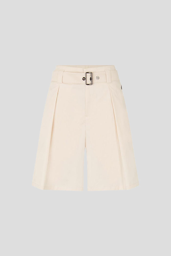 Ženski šorts Celia kombinuje funkcionalnost i sofisticiran stil. Izrađen je od elastičnog pamučnog gabardina koji omogućava udobnost i slobodu pokreta. Zahvaljujući A-kroju sa faltama, ovaj model odiše ženstvenošću i elegancijom, dok detalji poput kaiša sa metalnom kopčom i ušivenih džepova sa "B" logotipom dodatno naglašavaju prefinjeni dizajn.